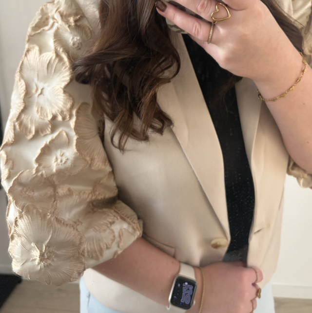 Beige Blazer met bloemen pof mouw
